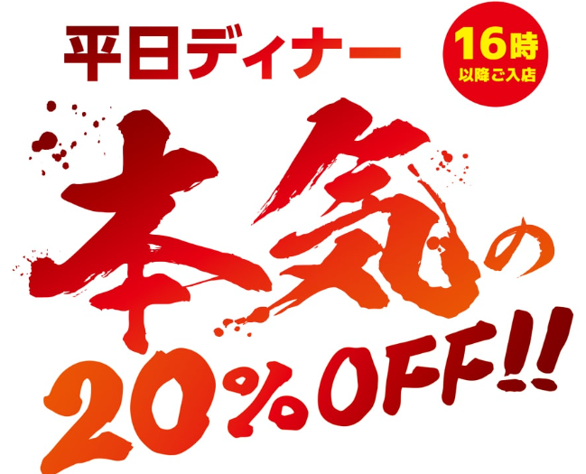 - 内容:平日ディナー(16時以降入店)でお食事代が20%OFF!