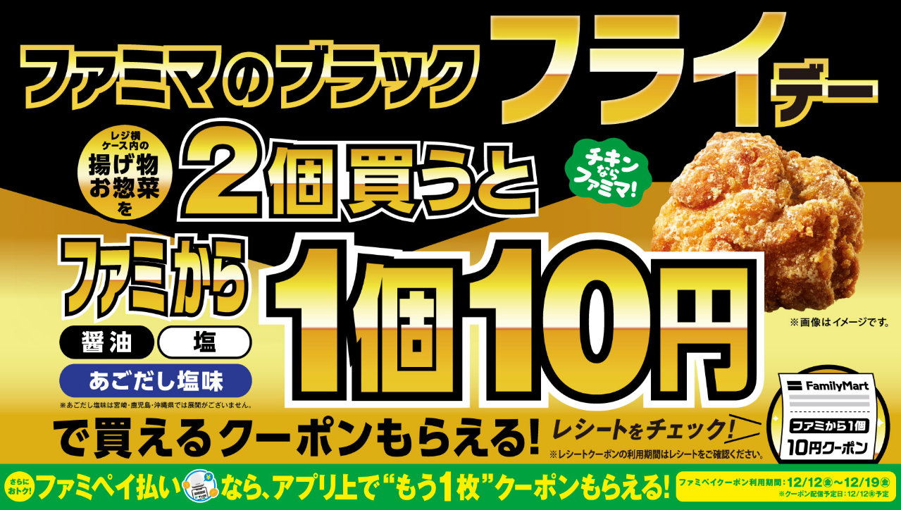 ファミマのブラックフライデーは、ちょっと工夫するだけで「ファミから」を破格で手に入れられるチャンスです!対象商品を2個ずつ、ファミペイで会計するだけで、レシートクーポンとアプリクーポンのダブル取りが可能。