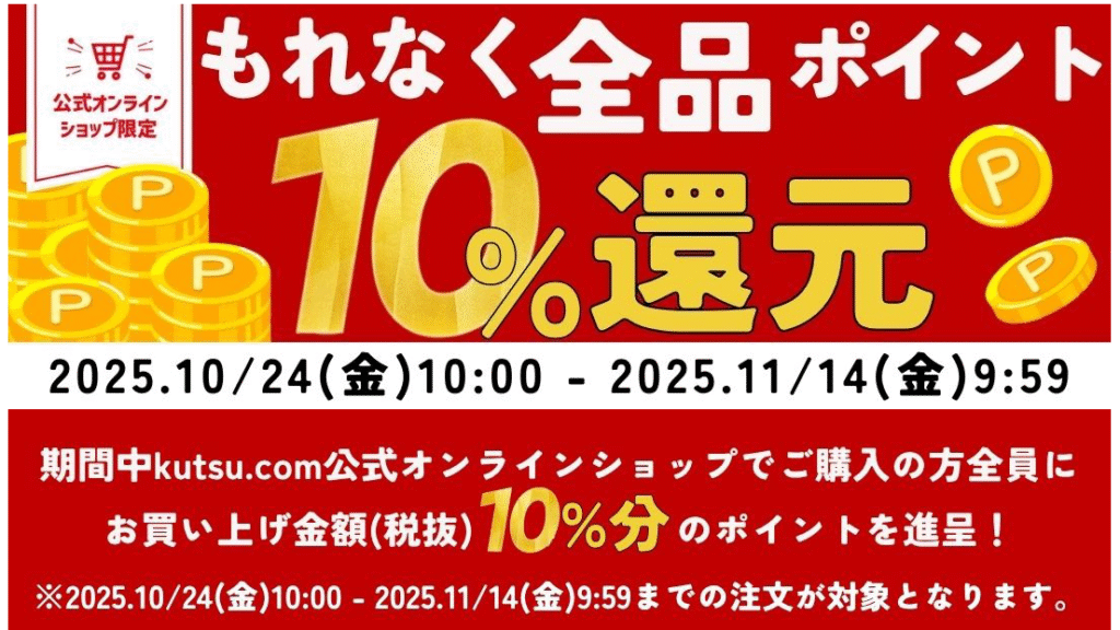 10月24日〜11月13日まで、kutsu.comアプリ会員限定で、「お買い上げ総額の10%相当のアプリポイント還元」キャンペーンを実施しています。