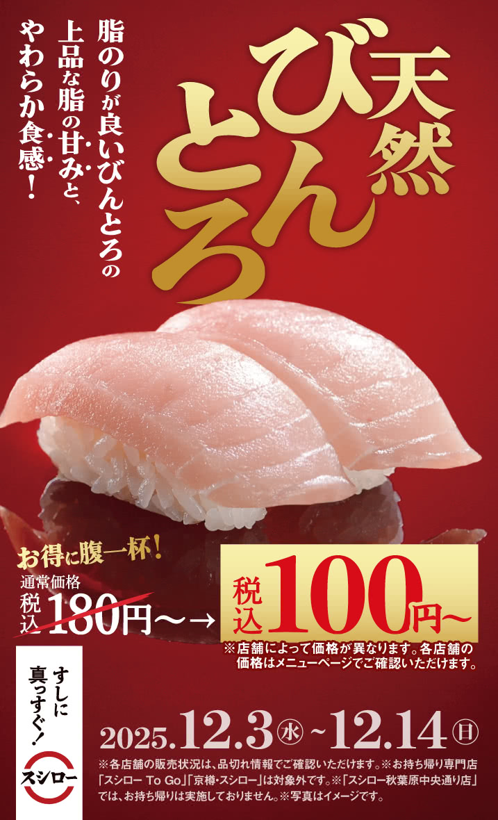 スシローの冬の超人気イベント「冬のうまいもん祭」がスタート! なんと今回は大人気ネタの天然びんとろが税込100円という衝撃価格で登場しています。
