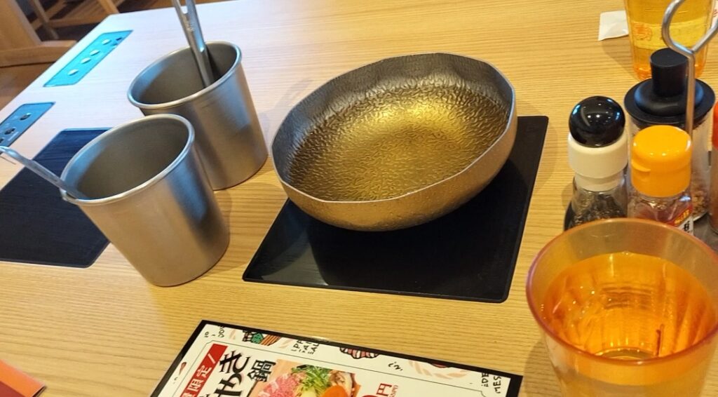 一人ずつしゃぶしゃぶ用の鍋、灰汁をすくうお玉が用意されています。